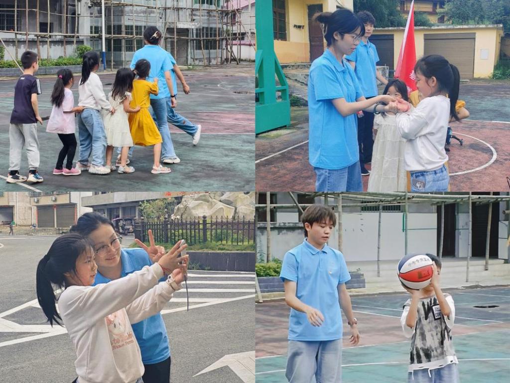 有的队员带领小朋友做游戏,队员们扮演老鹰,张开双臂,做出凶猛的样子,试图抓住排在“鸡妈妈”身后的“小鸡们”。“鸡妈妈”的角色则由另一位队员充当,她伸开双臂,努力保护着身后的小朋友。小朋友们紧紧拉住前面小伙伴的衣角,一边尖叫着,一边灵活地躲避着“老鹰”的攻击。有的队员手里拿着篮球,正耐心地给小朋友们示范投篮的动作,“小朋友们,像这样双手握住球,然后向上跳起把球投出去。”小朋友们围在旁边,眼睛一眨不眨地盯着,跃跃欲试。汗水浸湿了孩子们的额头,但他们的脸上洋溢着无尽的快乐和满足。志愿者们也仿佛回到了童年时光,和小朋友们一起沉浸在这欢乐的氛围中。
