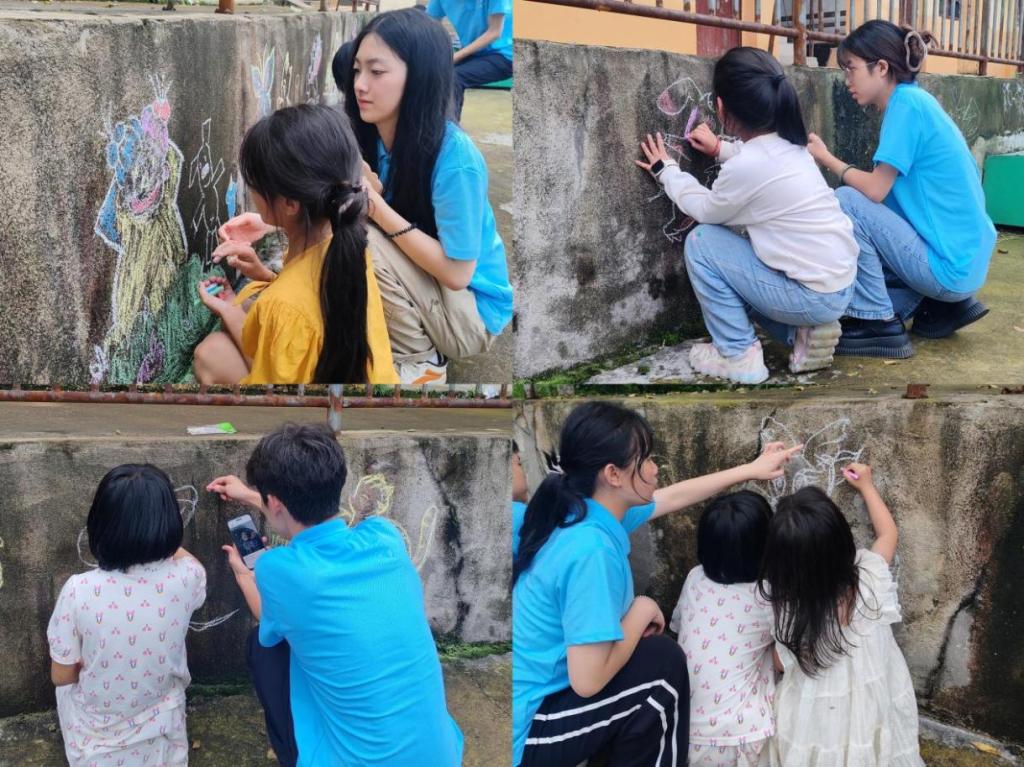 阳光明媚,地面被阳光晒得微微发烫,孩子们蹲在地上,小脸上满是好奇与期待。队员们则耐心地弯着腰,手中拿着彩色的粉笔,一边轻轻地在墙上勾勒着线条,一边轻声细语地向孩子们讲解着绘画的技巧和要点。孩子们在队员们的引导下,渐渐放开了手脚,五彩的粉笔在地面上跳跃着,画出了花朵、房子、小动物……各种充满童真的图案一一展现。欢笑声、讨论声交织在一起,仿佛奏响了一曲美妙的乐章。