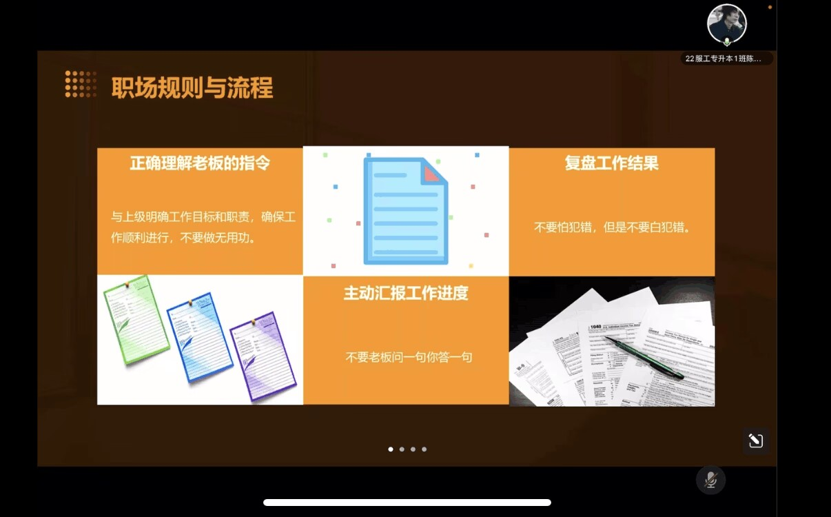 大四年级以“就业育人公开课之如何做好职场新人”为主题召开线上班会。通过辅导员讲解PPT,同学们熟悉职场新人需要具备的基本素质和能力。从思维方式的转变,到如何适应职场环境,再到职场压力与应对,每一个方面都需要毕业生们认真思考和努力实践。这些知识和经验不仅帮助毕业生更好地适应职场环境,也为未来的职业发展指明了方向。