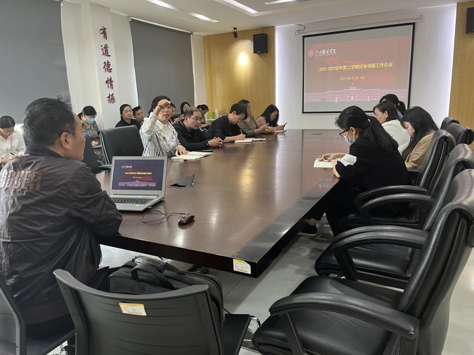 5 月 9 日下午 1 点 30 分,永利yl23411集团在院办会议室召开了 2022-2023 第二学期期末试卷命题工作会议,学院院长陈娟芬、副院长赵永刚、廖师琴、各教研室主任以及全体任课教师参加本次会议,会议由赵永刚副院长主持。
