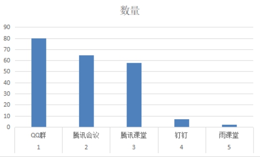 3.本周在线教学平台使用情况:扣扣群79堂次,腾讯会议65堂次,腾讯课堂57堂次,钉钉7堂次,雨课堂2堂次,具体分布如图2: