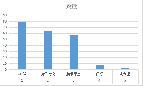 4. 本周在线教学平台使用情况:扣扣群79堂次,腾讯会议65堂次,腾讯课堂57堂次,钉钉7堂次,雨课堂2堂次,具体分布如图4: