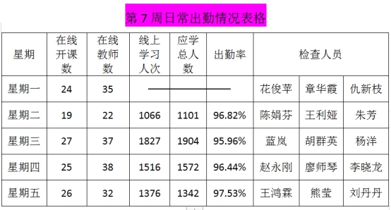统计好每日线上教学教师数量、开设课程门数、学习人次以及出勤率,本周应学习人次7776,实际学习人次7522,出勤率为96.73%。
