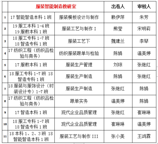 5、整理及核实2020届本、专科毕业生专业课重修学生各类科目信息,根据本学期授课任务合理安排重修课程指导老师,对没有开课的课程,进行课程组研讨然后再安排指导老师,同时要求老师对联系不上的学生,要及时和院教学秘书进行反馈,落实到每位同学。(《服装跟单》课程安排了陈娟老师负责学生免听重修辅导、《服装生产管理》课程安排了张继红、温美婷老师负责学生免听重修辅导、《服装生产实训》课程安排了涂晓明等老师负责学生免听重修辅导、《服装工艺》课程安排了熊莹等老师负责学生免听重修辅导)