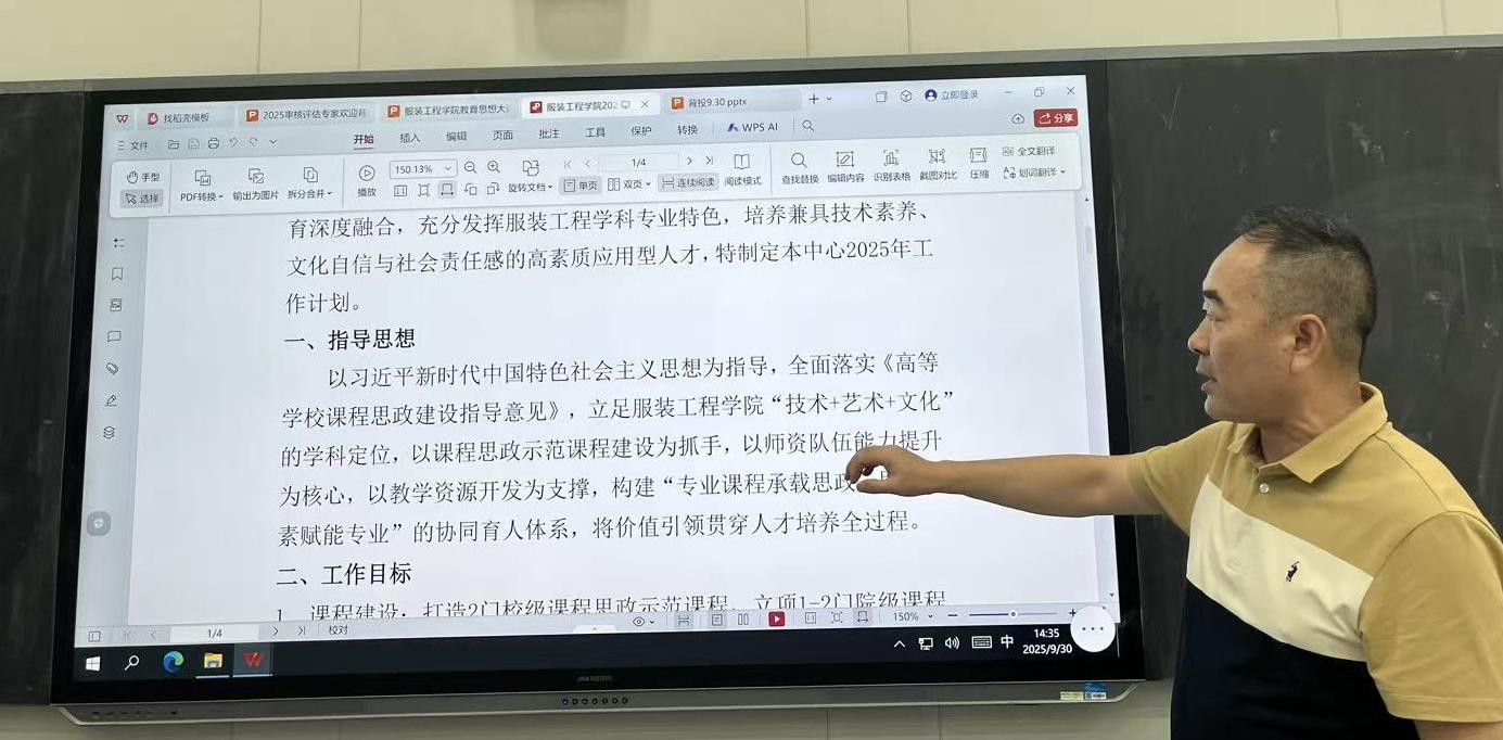 会议开始,赵永刚副院长结合学院学科特色与人才培养目标,深入解读《高等学校课程思政建设指导意见》的核心要求。赵院长强调服装工程学科兼具技术性与文化性,需将课程思政建设与专业教学深度绑定,既要夯实学生的服装结构设计、工艺制作等专业能力,更要通过思政元素浸润,培养学生的文化自信、工匠精神与行业责任感,真正实现 “以技载道、以文化人” 的育人目标。 同时,他强调各教研室需加强协同配合,定期召开工作推进会,及时解决建设过程中的难点问题,确保课程思政各项任务落到实处。