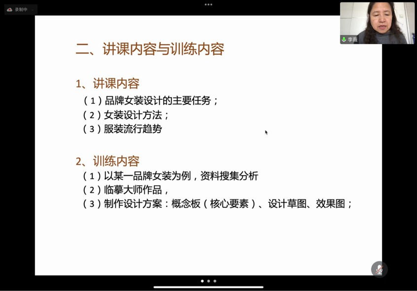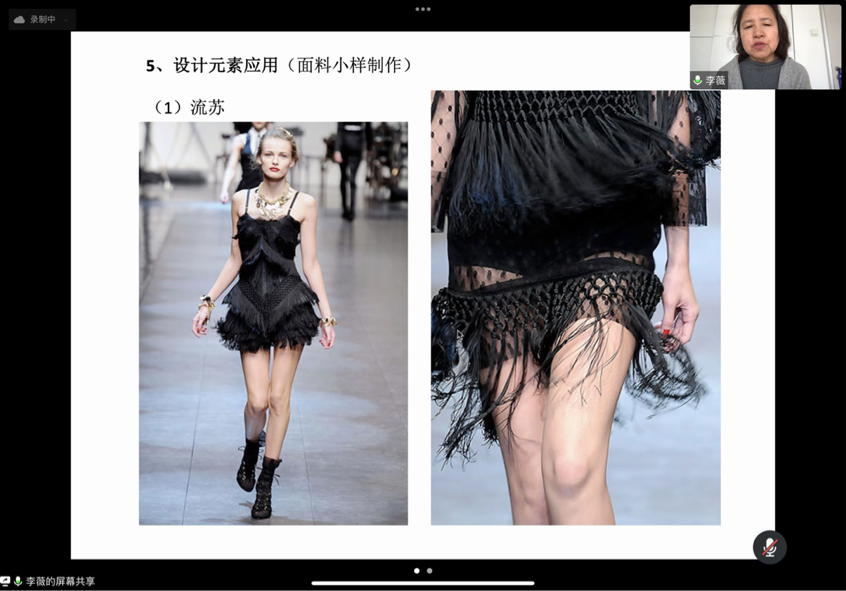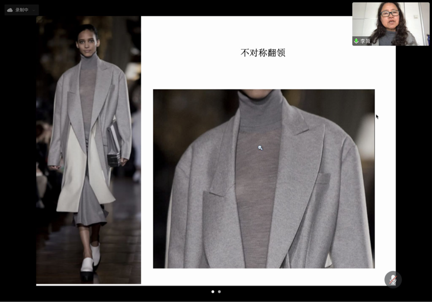 永利yl23411集团第四届服装大师班本学期第四周课程于3月19日如期开课,本次开讲的课程是《品牌女装款式设计》,课程教学时间为期两天,由于疫情原因课程采用线上教学的形式,由清华大学美术学院博士生导师、巴黎高等装饰艺术学院访问学者、中华服饰文化研究会理事、2014年中国国际十佳设计师李薇老师主讲。