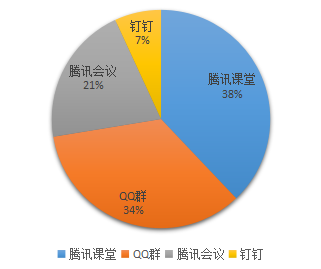 线上授课时间为2020年2月24日星期二至2020年2月28日星期五,学院第一周共开启了44门网络平台课程,共计59位教师在线授课,而线上听课学生累计7457人次,学生到课率96.26%。总体来说采用超星平台、学堂在线和学校网络教学平台等进行网络建课;在直播方式上主要采用了钉钉、腾讯会议、腾讯课堂、QQ群四大平台进行直播授课,班级使用平台所占比例如下:
