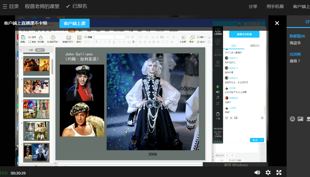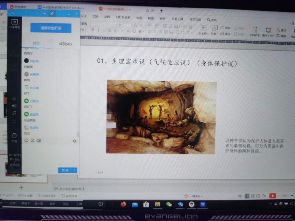 杨眉老师的《中外服装史》课程要求学生通过超星学习通课前预习本课程的主要知识点,在课上进入腾讯课堂进行正式课程讲解和学习,并就该课程学生能从中学习到什么以及如何将历史元素融合现代服装展开了讨论,提高了学生学习本课程的兴趣和积极性。通过对服装史知识的融会贯通,加深了学生对于时代服装演变的印象,教学效果良好。