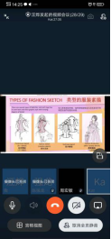 本次听课中汪烨和卡佳老师的《服装画技法》采用双语教学。该课程采用学银在线建课,已将丰富的教学资源上传给学生在线学习,课上老师们采用钉钉进行直播教学。在授课中教师们教学基本功扎实,学生通过观看共享屏幕和讨论区互动,进一步消化和巩固课程内容。