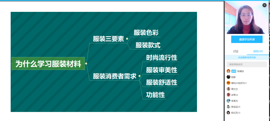 陈娟芬院长在18服教本科1班《服装材料学》课程中采用线上+线下混合式教学法,要求学生课前在学习通上预习主要知识点,并完成相应章节测验,陈院长通过超星平台数据统计充分了解学情,以便在课上直播时开展有效答疑互动。课上陈院长在腾讯课堂上进行直播,同时灵活运用学习通开展各种活动,如主题讨论,投票,抢答等等,不仅从形式上丰富了教学,而且有效调动了学生参与课堂的积极性,师生互动良好,课堂氛围活跃,教学效果显著。