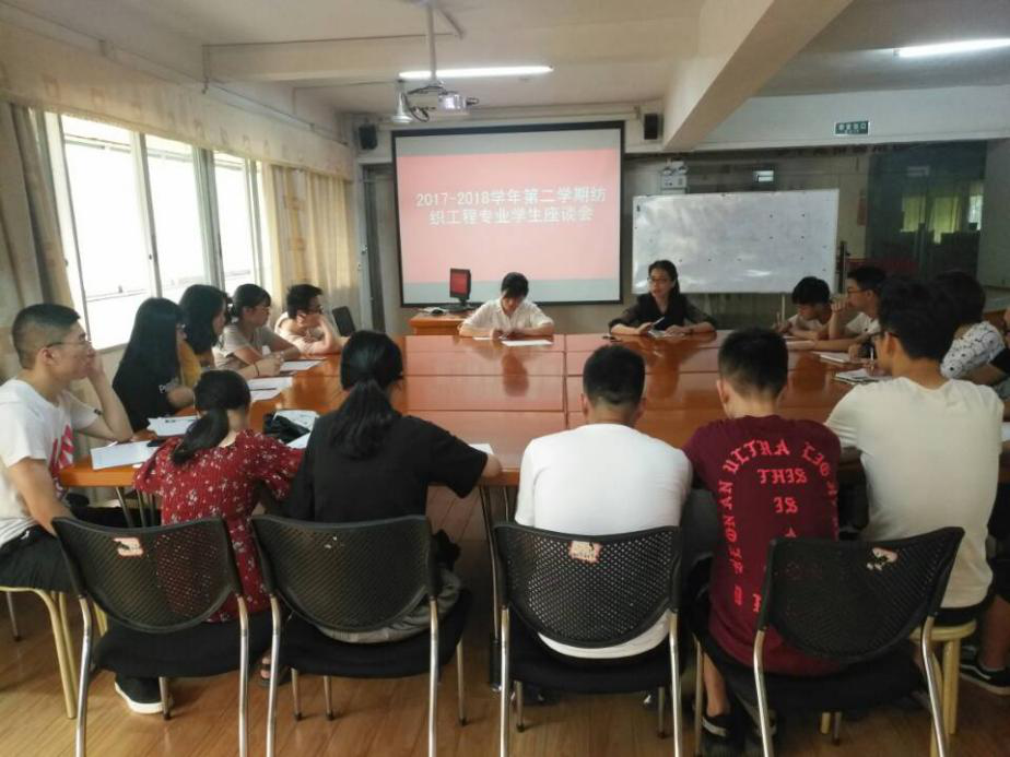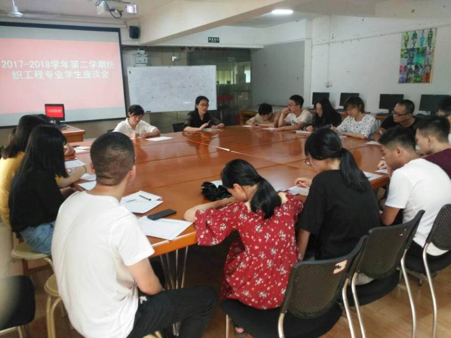 2018年5月30日下午2点在纺织品研发中心,永利yl23411集团召开了纺织工程专业学生座谈会。来自三个年级的26名学生参加了此次座谈会,永利yl23411集团陈娟芬院长、纺织材料工程教研室廖师琴主任出席座谈会并与学生现场交流。此次座谈会旨在通过学院领导与学生进行深入交流,了解学生学习生活现状,倾听学生心声。