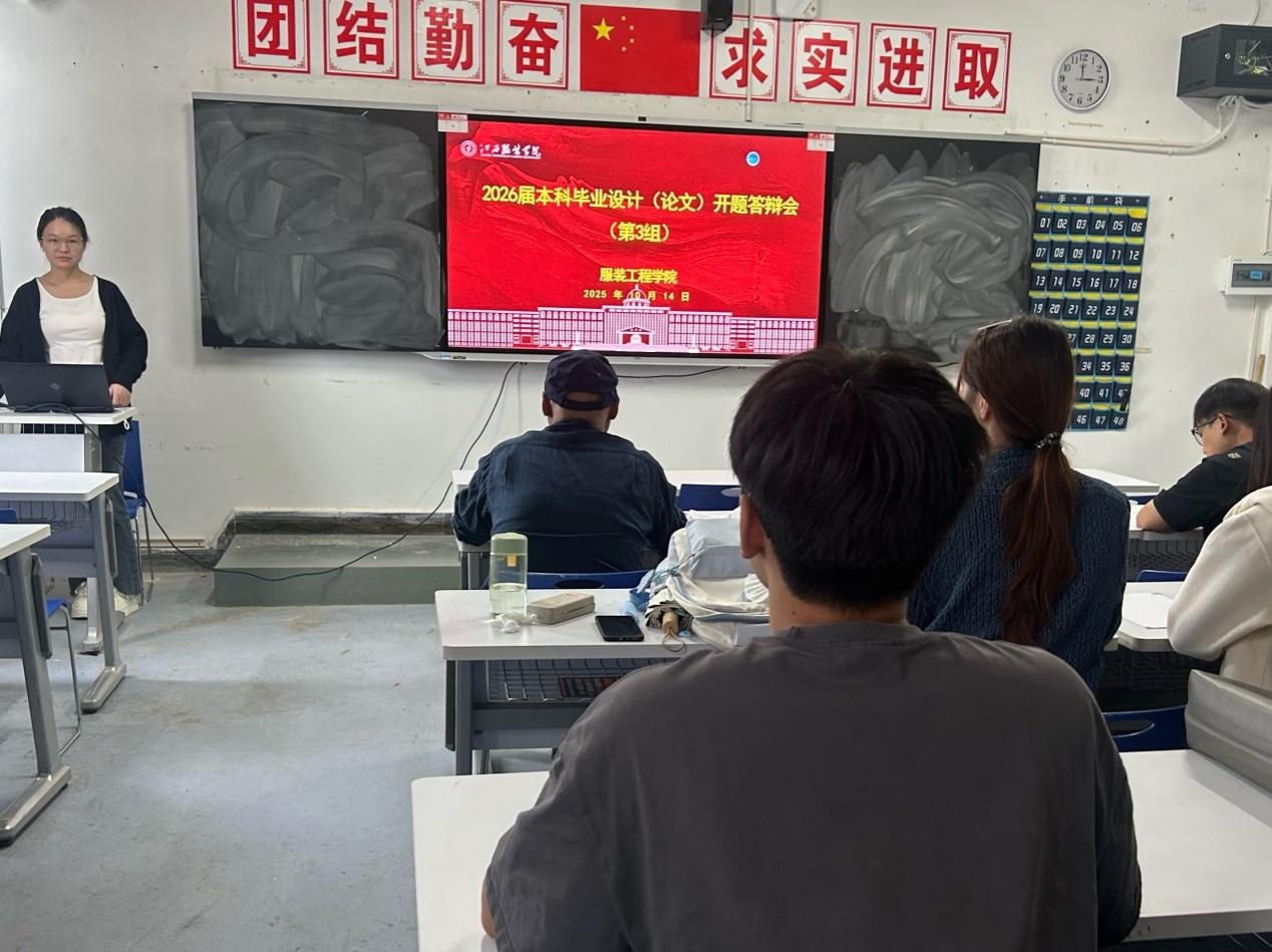 为确保学生的研究选题具有可行性、创新性和实用性,帮助学生明确研究方向,及时调整研究思路,确保毕业设计工作顺利进行,2025 年 10 月 14 日下午 13:00 学院服装设计与工程、服装设计与工艺教育、纺织工程三个专业 20 个小组共计 195名本科生在主教楼开展了 2026 届本科生的开题汇报工作。此次汇报主要是为了检验学生毕业设计选题思路、研究计划以及前期准备情况,为学生后续的毕业设计工作提供宝贵的反馈与指导。