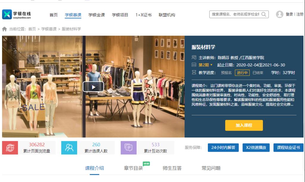 本课程2019年认定为江西省精品在线开放课程,课程围绕消费者对服装审美性、时尚性、功能性、安全舒适性、易打理性和生态环保性等等要求,解读服装材料的性能、服装服用性能与风格特征和典型服装服装材料,掌握从服装材料视角解读服装审美性、时尚性、功能性、安全舒适性、易打理性和生态环保性的,发现服装材料之美,品味服装文化,提高社会文化修养及生活品味,使学生树立正确的时尚观、审美观以及生活观。