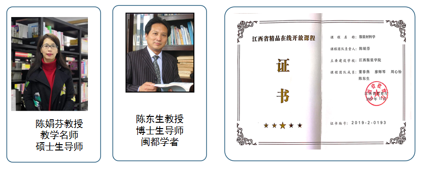 课程负责人陈娟芬教授是江西省教学名师,江西省精品在线开放课程和精品资源共享课《服装材料学》主持人,主持省级服装设计与工程专业综合改革试点项目,江西省服装设计教学团队负责人, 与国家精品课程、精品资源共享课程负责人陈东生教授等5人组成了课程教学团队,团队成员荣获省级教学成果一、二等奖、纺织工业联合会教学成果二等奖、三等奖等多项,主编“十二五”精品规划教材《服装材料与应用》等教材4本。