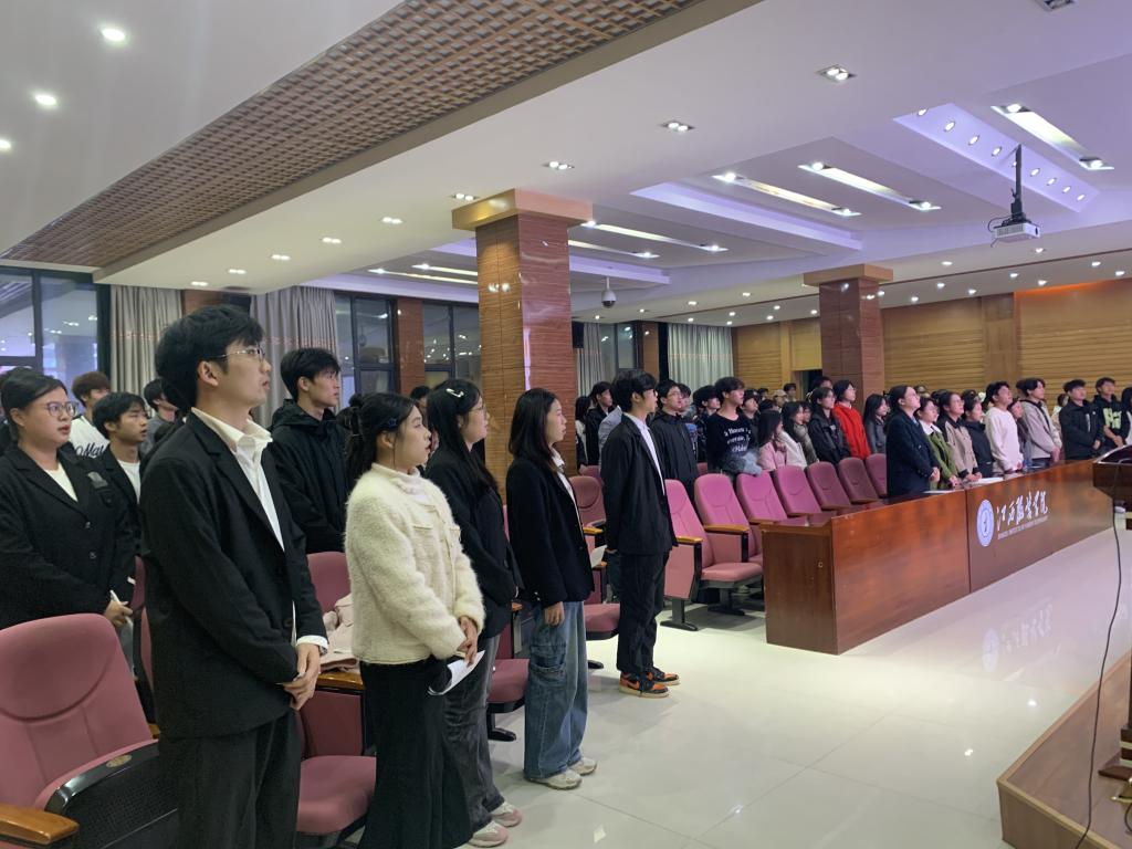 大会最后一项,由洪婷作总结讲话。洪婷首先对第二届班委联合会的同学们辛勤的努力和付出表示了肯定,并对新一届班委联合会的成员表示祝贺。洪婷带领全体与会人员共同学习了本科教育教学审核评估知识,号召大家主动学习评估知识,遵守课堂学习纪律,规范自身行为,为学校的审核评估贡献自己的一份力量。最后她希望同学们要树立远大理想,明确学习目标;要端正学习态度,做到博学善思;要积极参加实践,做到强能躬行。