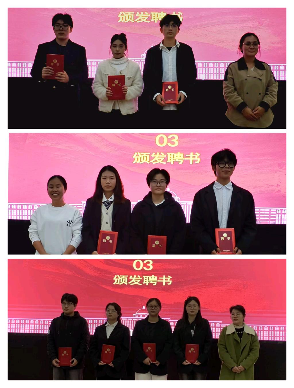 大会第三项,由学工办副主任洪婷,辅导员江青燕、卢永红为第二届班委联合会会长、副会长、各部门部长以及副部长颁发聘书。