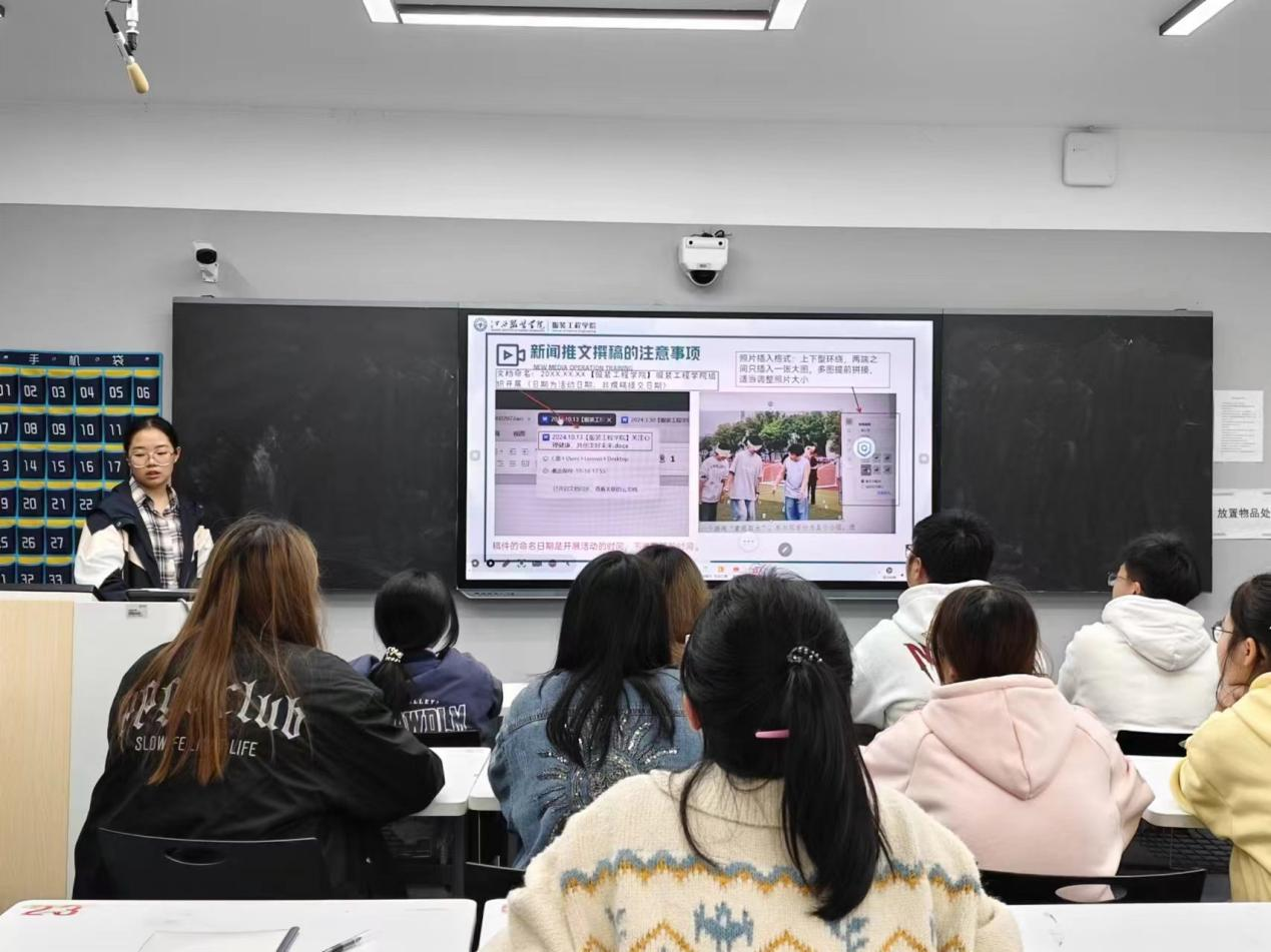 会议第三项,由王舒进行总结讲话。王舒一一列举了照片拍摄和新闻稿撰写中存在的问题,并要求新媒体工作人员注意细节,用心拍摄,用心撰稿,将认真负责的态度一以贯之,同时要注重新闻宣传,让更多的师生了解和关注学院动态。