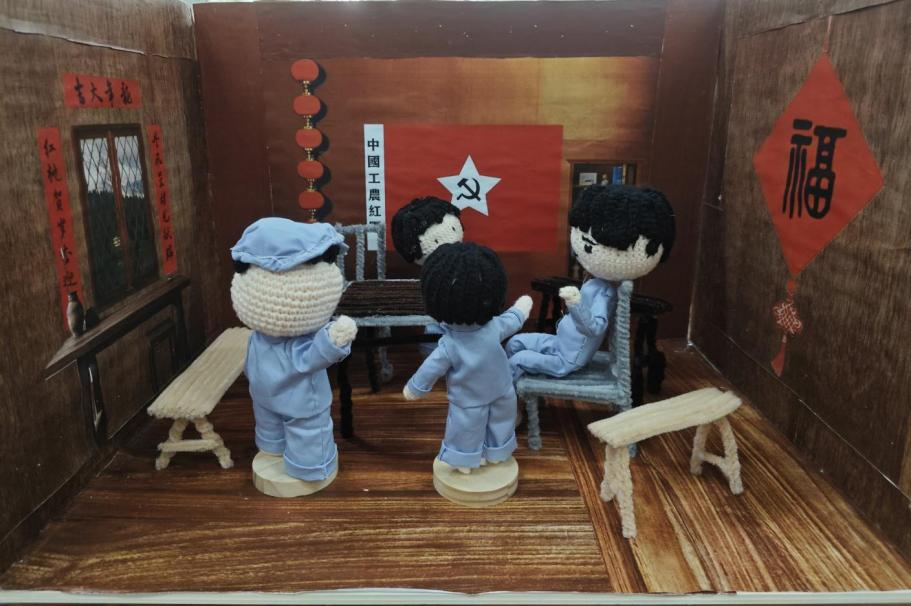 贺龙同志申请入党几十次都没有被批准,1927年9月入党的心愿终于实现。贺龙的入党宣誓仪式是在瑞金绵江中学举行的,由周恩来主持,李立三、恽代英、谭平山等出席。作者结合服装设计与工艺专业,运用钩针编织技艺,重现贺龙入党宣誓场景,学生在创作的过程中感悟革命先烈坚定不移向党组织靠拢的决心和信念。