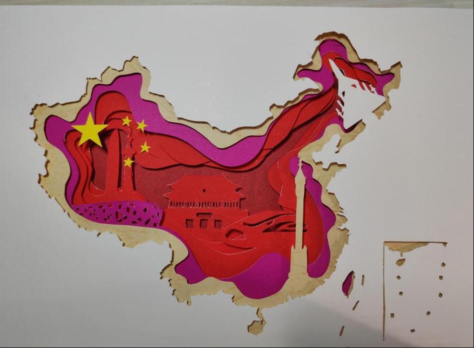 纸雕,又称纸浮雕,起源于中国汉代,是中国民间的非遗技艺之一。作品通过纸雕的形式展现,让纸张一层层重叠,使祖国的大好河山一层层展现出来,让原本朴素的纸张,在光影之下呈现出真实而又梦幻的画面。感恩伟大的祖国,何其有幸生于华夏,安于盛世,见证百年,我们愿以青春捍卫盛世之中华,祝福伟大的祖国繁荣昌盛。