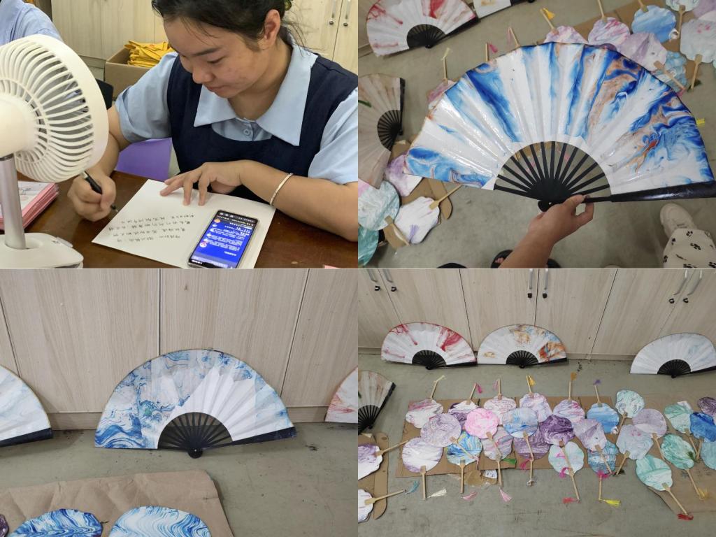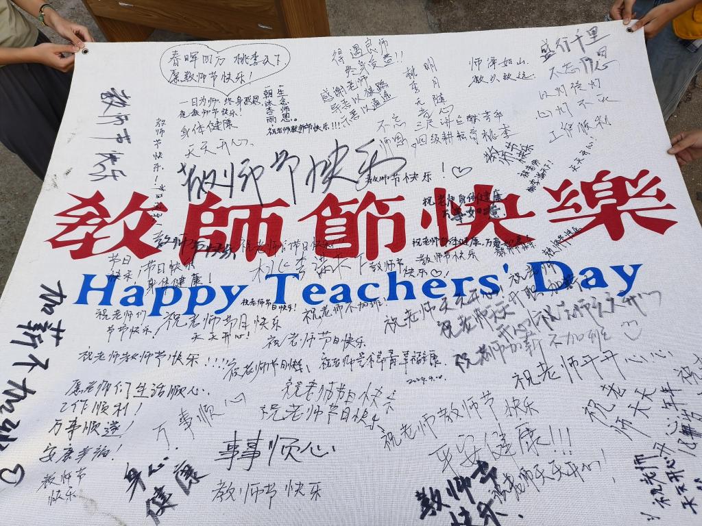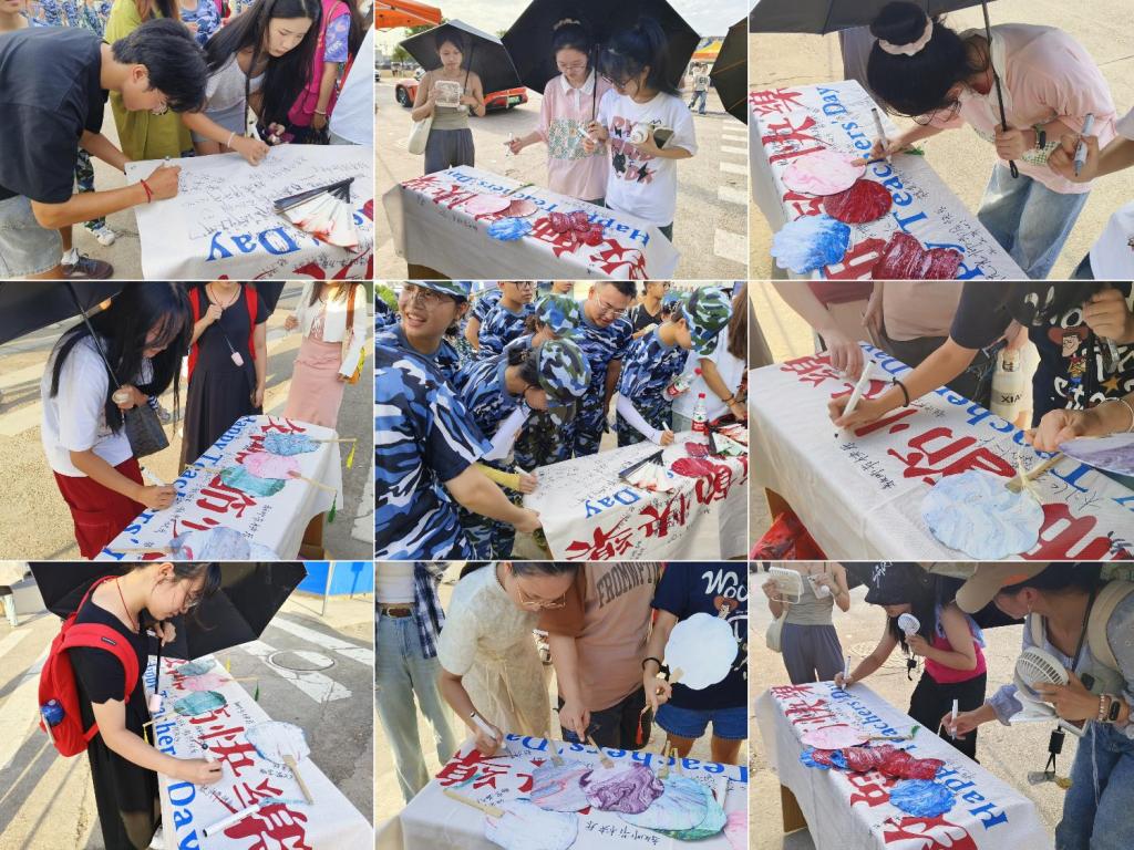 活动前期准备阶段,同学们自发组织起来为老师们写下充满美好祝愿的贺卡,制作传统手工艺品漆扇。活动现场热闹非常,大家在海报上写下对老师的祝福语,并进行合影留念。在工艺品发放完之后,仍有众多同学自发参与其中,写下对老师们的美好祝愿。