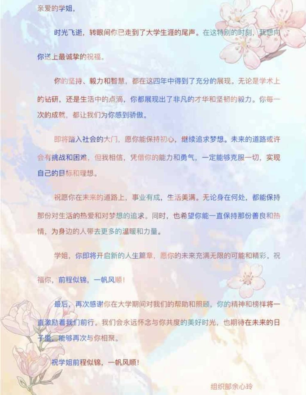 学院学生会组织部的余心玲同学为学姐写了一封饱含真情的信。