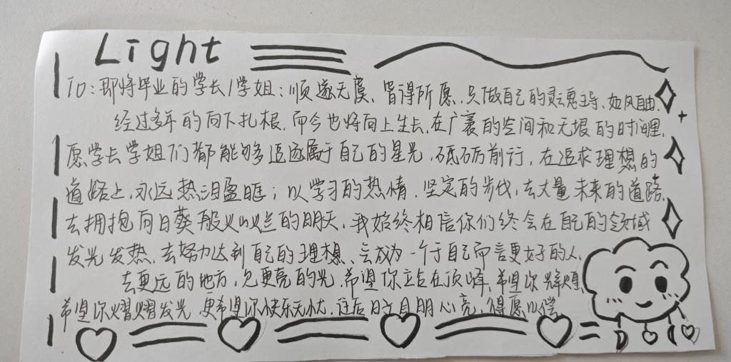 23服教本科1班的郭欣雅同学为学长学姐写下了祝福,字字都代表着诚挚的祝福与希望: