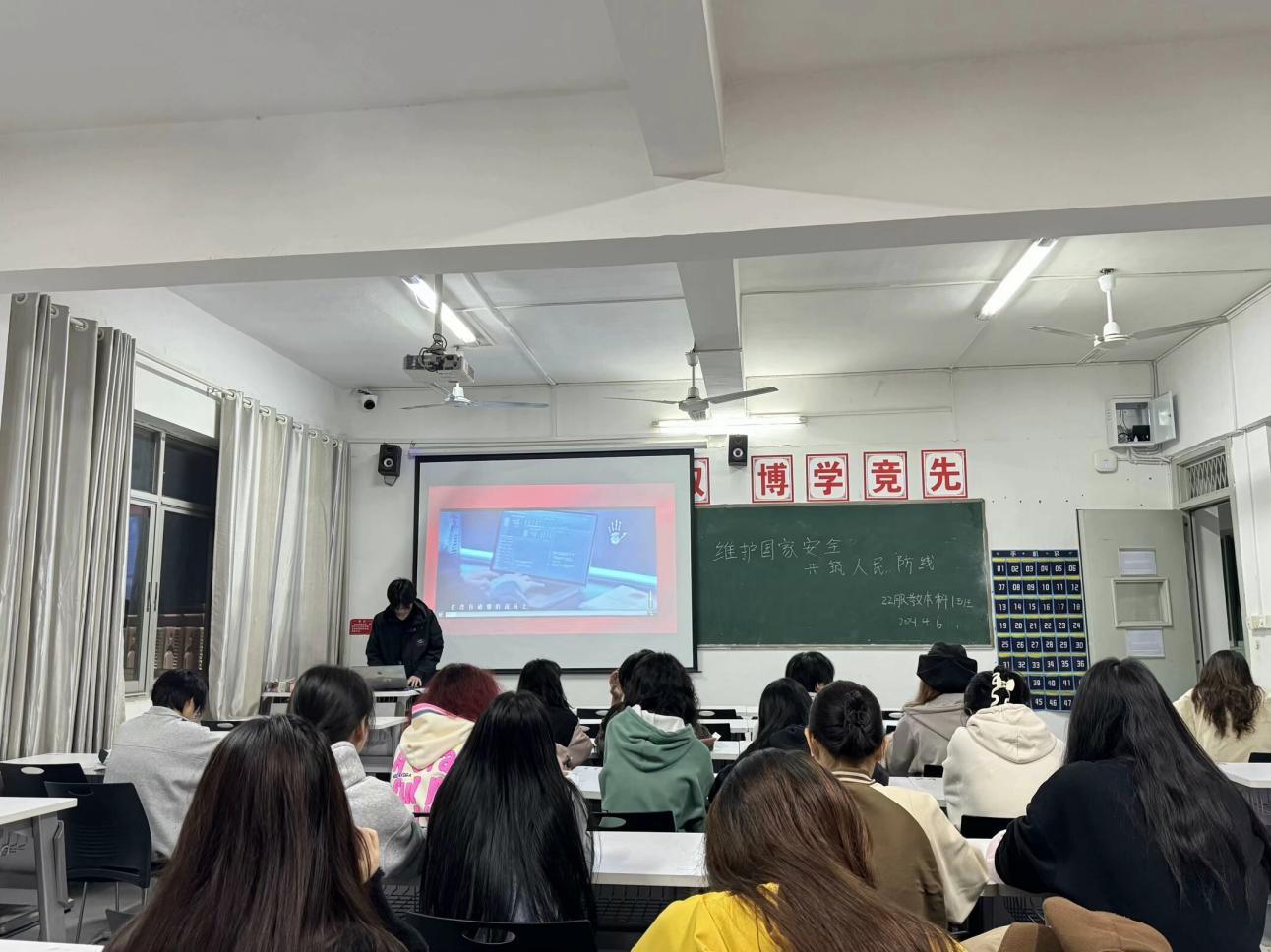 大二各班级召开了“维护国家安全,共筑人民防线”主题班会。班会从国家安全教育日的基础知识、背景、具体内容、义务、警惕诈骗及抵制措施等几个方面展开,号召大家树立“国家安全,人人有责的观念”,同学们明白了国家安全不仅包括军事安全,还包括经济安全、网络安全等各个领域的安全,懂得了维护国家安全是每个公民应尽的义务,要为国家安全奉献自己的一份力量。
