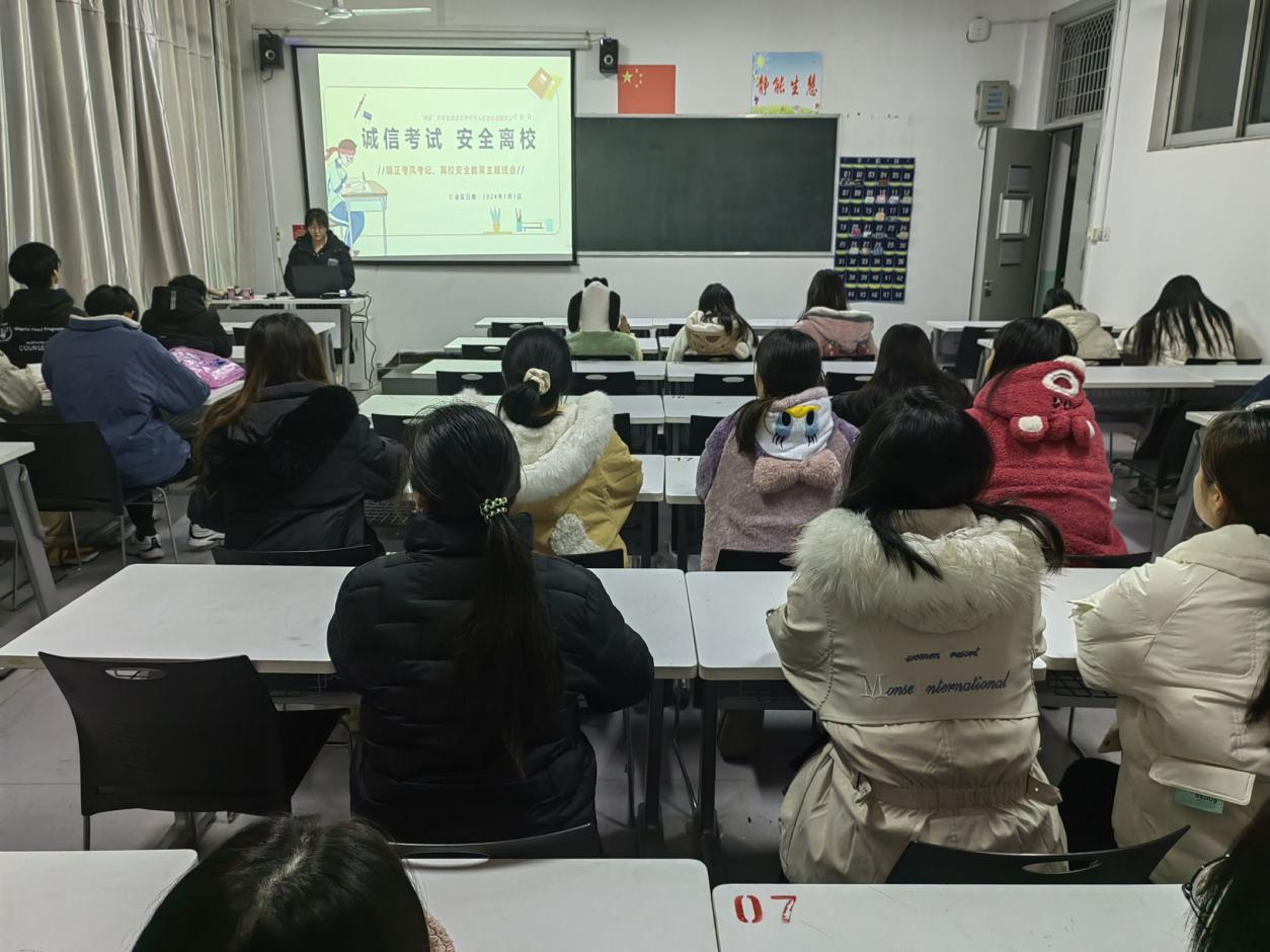 永利yl23411集团讯(撰稿:钟佳妮)1月1日晚 7:00,永利yl23411集团院组织各年级召开了“端正考风,诚信应考”“诚信考试,安全离校”“安全度寒假,平安过春节”“家校共育,共话毕业”主题班会,班会由各班班长主持。