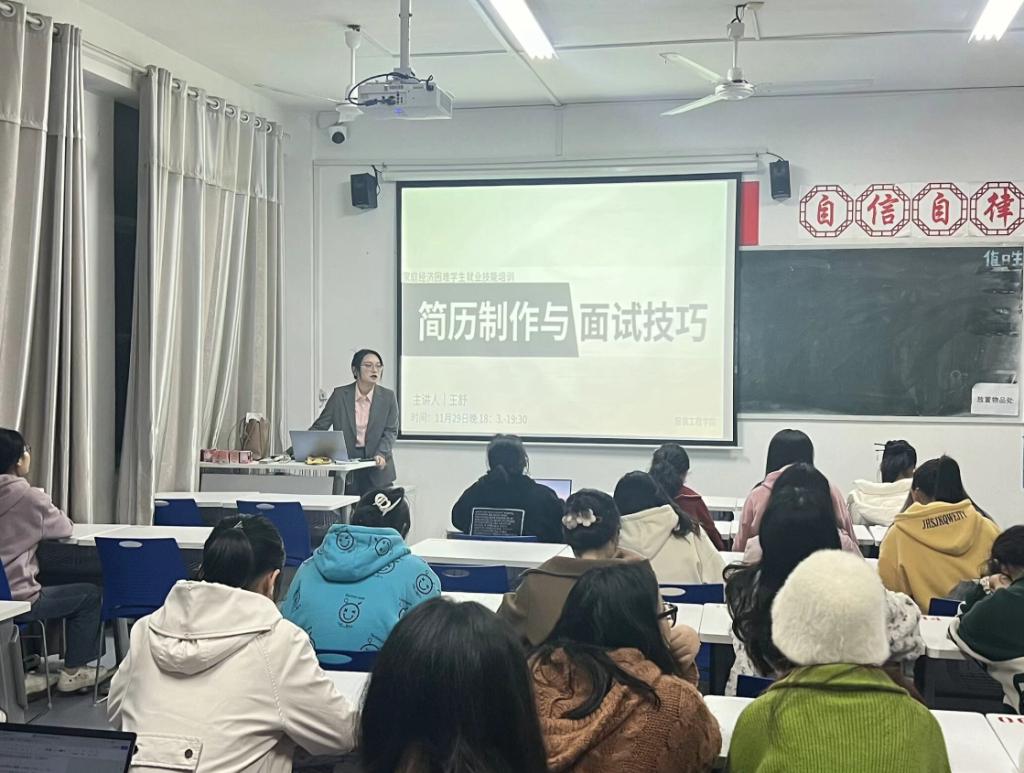 王舒从简历制作和面试技巧两方面展开讲解。王舒强调简历制作包含基本信息、教育经历、奖项荣誉、实践经历和个人评价等五个方面,学校会针对不同学生的兴趣和专业方向,提供个性化的就业技能培训服务,帮助他们更好地适应就业市场的需求。王舒强调,毕业生一定要脚踏实地做好个人职业发展规划,客观理性地分析自身能力与专长,清晰认识当前就业形势,选择适合自己的工作岗位。