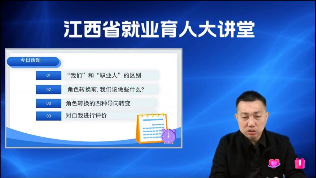 本次邀请到的主讲人是来自新余学院的全球职业规划师——钟德敏。钟德敏主要围绕“‘我们’和‘职业人’的区别”“角色转换前,我们应该做些什么”“角色转换的四种导向转变”和“对自我进行评价”四个方面展开讲解。直播课上,钟德敏首先向师生们讲解了应该如何做好就业前的准备工作,以及进行角色转变的注意事项和要点。钟德敏强调,大学生在进行职业选择前要先进行充分的自我认识,要结合自己的兴趣、能力和目标来进行选择。可以通过实习、交流、咨询等方式来了解更多职业信息,以便做出更明智的选择。