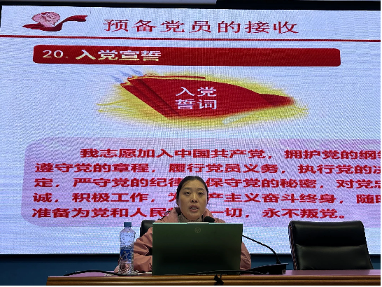 随后,校党委委员、组织部部长、党校校长陈翠娥同志以《发展党员工作程序、中国共产党党徽党旗工作条例》为题开展第一次培训学习。她指出,发展党员工作要坚持党章规定的党员标准,始终把政治标准放在首位;坚持慎重发展、均衡发展,有领导、有计划地进行;坚持入党自愿原则和个别吸收原则,成熟一个,发展一个。