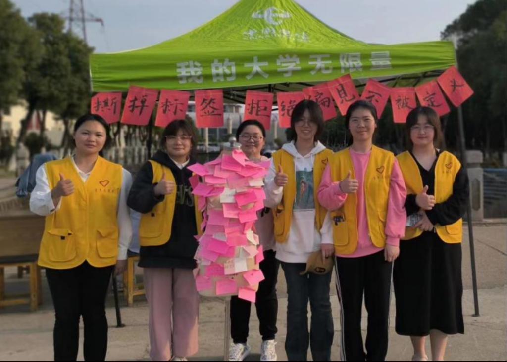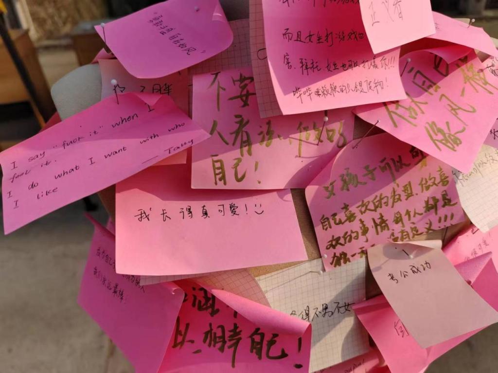 同学们打出了本次活动的标语:“撕掉标签”“拒接偏见”“不被定义”。如今,被打上标签,被定义是一件经常却又无可奈何的事情,而女生往往也会被打上各式的标签。我院志愿者们在现场准备了简笔贴和人偶架,并向路过的同学们解释本次活动的目的。路过的同学们纷纷把人偶上的定义标签撕下来,写上“做真实的自己”“拒绝焦虑”“你很漂亮”以及对自己未来的期望等语句。
