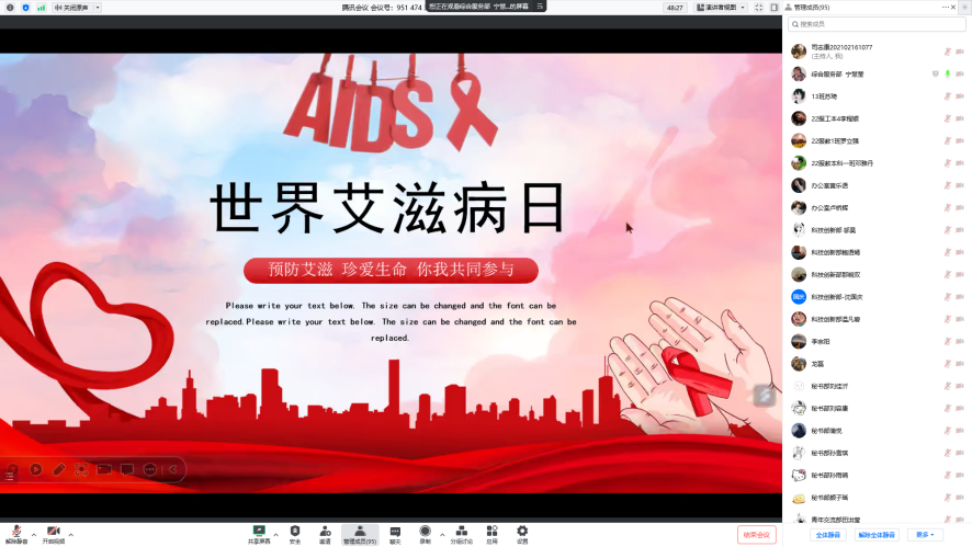 通过本次“世界艾滋病日”活动的开展,大大增强了同学们的健康意识,营造了良好的防艾氛围。作为新时代新青年更应该正确认识艾滋病,做到不畏惧不歧视艾滋病,一起携手共抗艾滋病,共享健康。