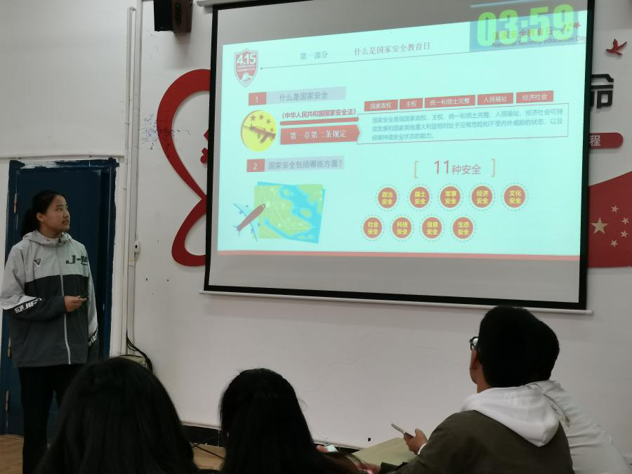 21纺织本科1班班长王雯慧就国家安全进行演讲,她强调,国家安全是国家的基本利益,是一个国家处于没有危险的客观状态,也就是国家没有外部威胁和侵害也没有内部的混乱和疾患的客观状态