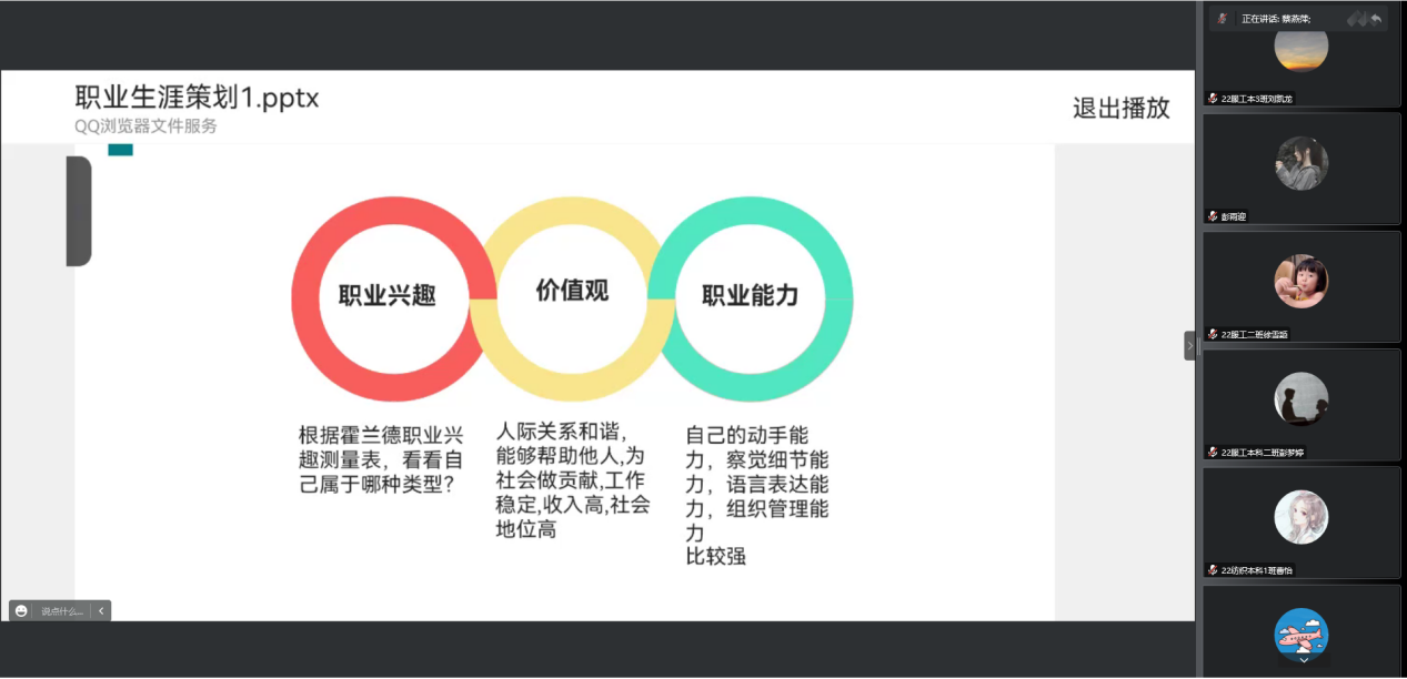 为引导2022级新同学正确认识当前的就业形势,进一步明确学习目标,合理做好职业生涯规划,10月1日上午9:30,永利yl23411集团组织22级新生在线上开展了“职业生涯规划”入学教育,本次讲座由学院专职组织员蔡燕萍担任主讲。