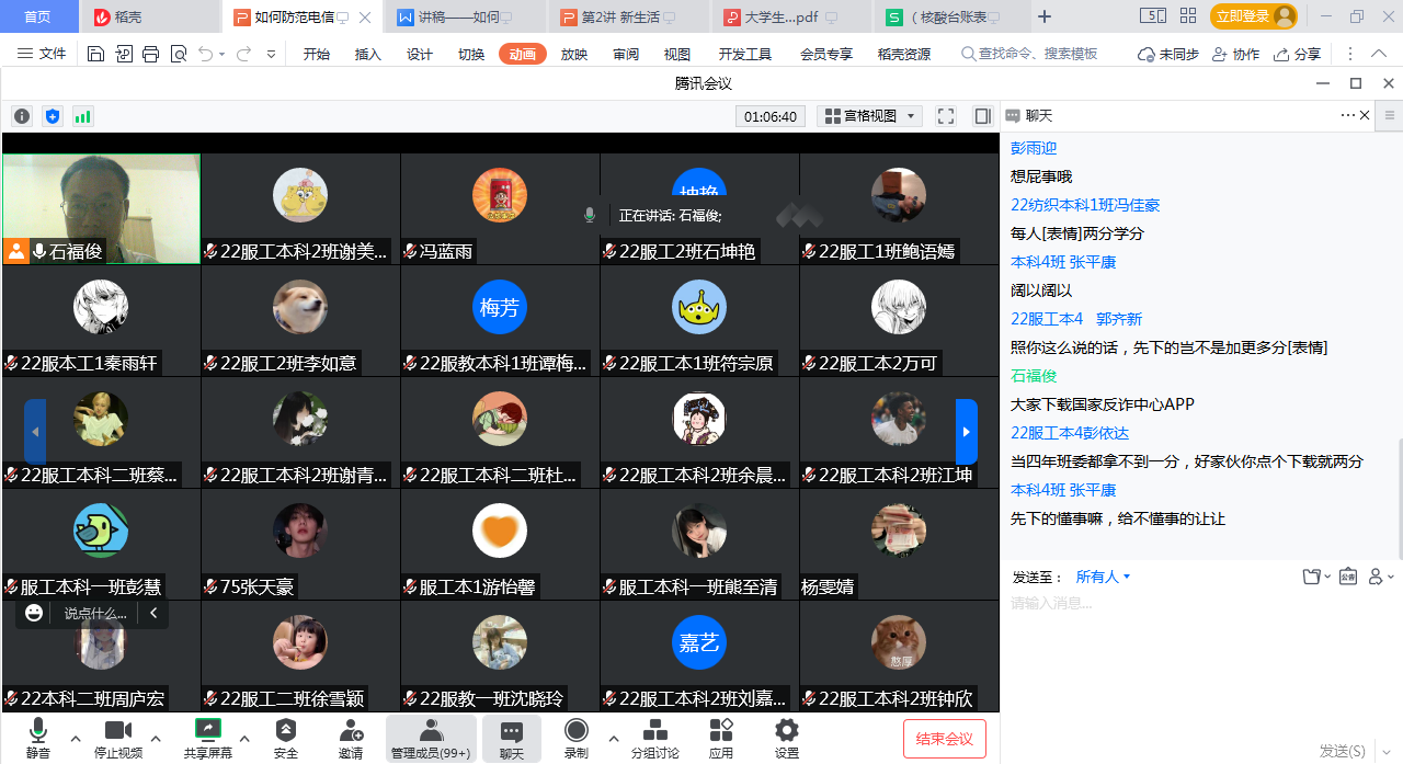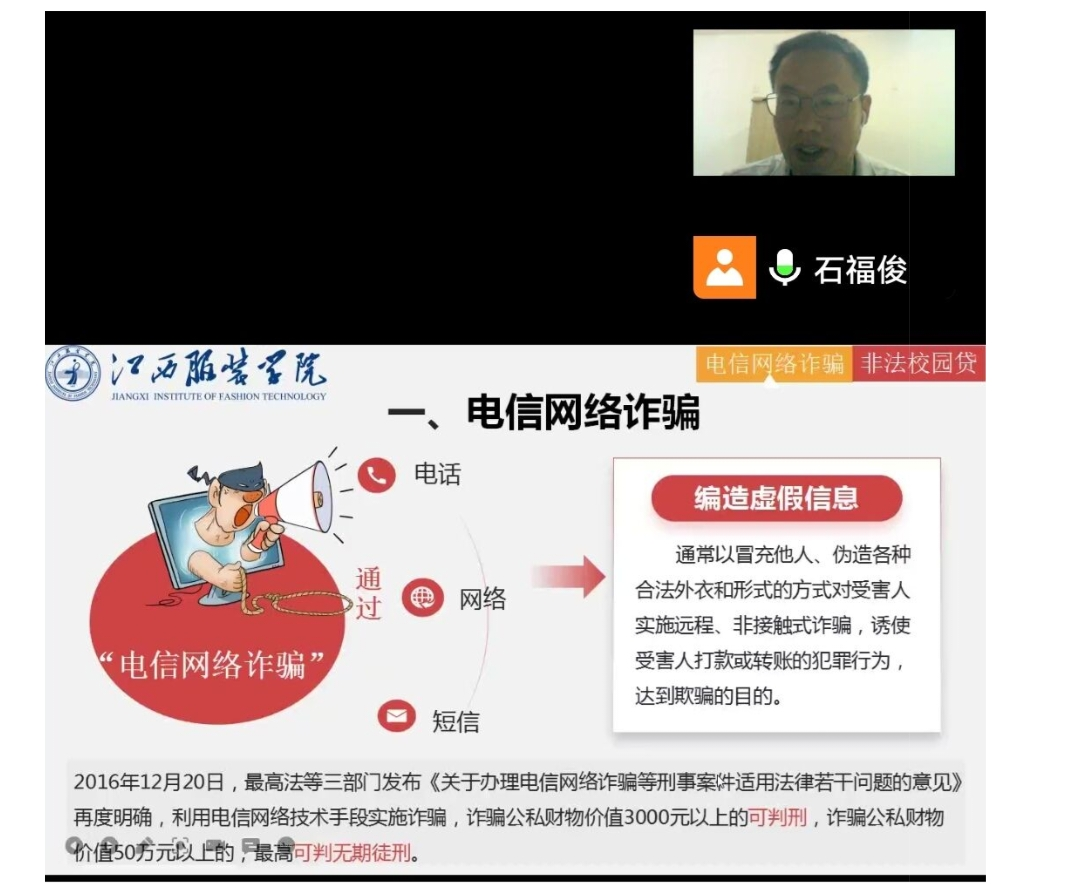 永利yl23411集团讯(撰稿:许诺)为了帮助2022级新生尽快融入大学生活,增强同学们的安全意识,提高辨别、抵制网络诈骗能力,拒绝高消费与超前消费,引导同学们树立正确消费观,养成文明、健康、节俭的生活习惯,提高同学们在生活中自我防范、自我保护和自我应对的能力,永利yl23411集团组织各新生班级于9月18日晚7时在线上开展了“如何防范电信网络诈骗及非法校园贷”专题讲座。