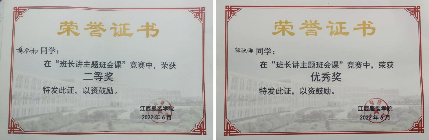 本次比赛从爱校荣校、诚信感恩、安全教育、心理健康教育、理想信念教育、职业生涯规划与指导、班级文化建设等方面出发,班会主题多样、贴近实际,对发挥学生“四自”管理、推进学校学风建设具有深刻的现实意义和长远意义。经过初赛、复赛、淘汰赛和决赛4个环节的层层角逐,永利yl23411集团21服艺专科2班的杨欣雨荣获二等奖、21服工本科1班的陈欣雨荣获优秀奖。