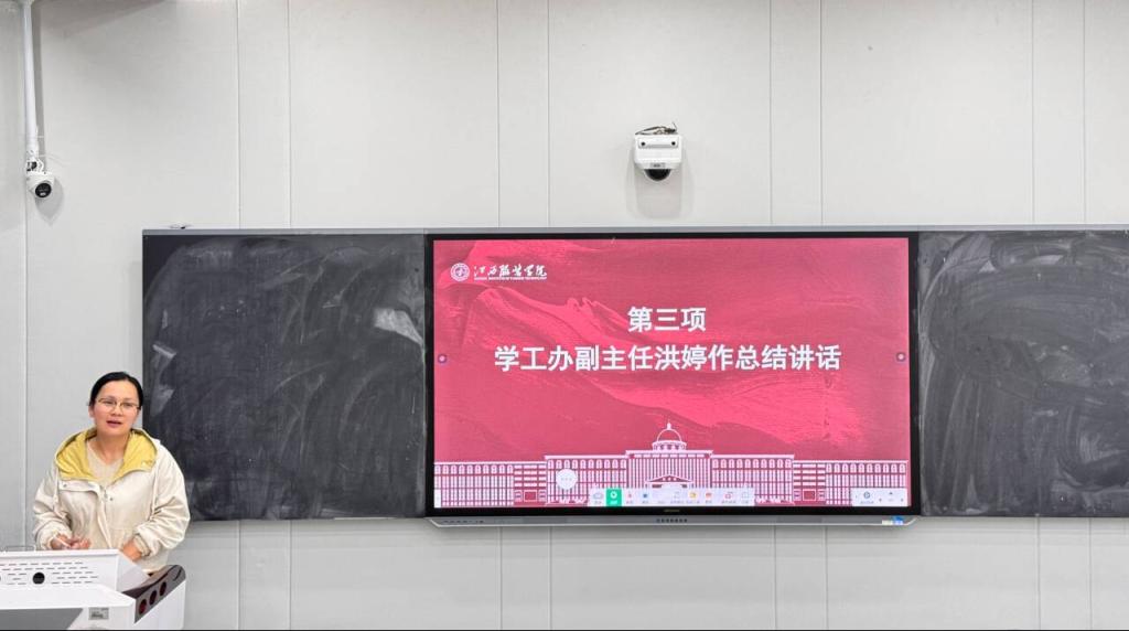 会议第三项,由学工办副主任洪婷作总结讲话。洪婷强调本学期学校即将迎来本科教育教学审核评估,希望全体班委要以身作则,带领同学们以积极向上的精神风貌迎接审核评估。同时她提出作为班级建设的主要力量,要充分发挥先锋模范带头作用,在新的学期主动作为,引领班级同学提升综合素质,为学院的发展贡献力量。
