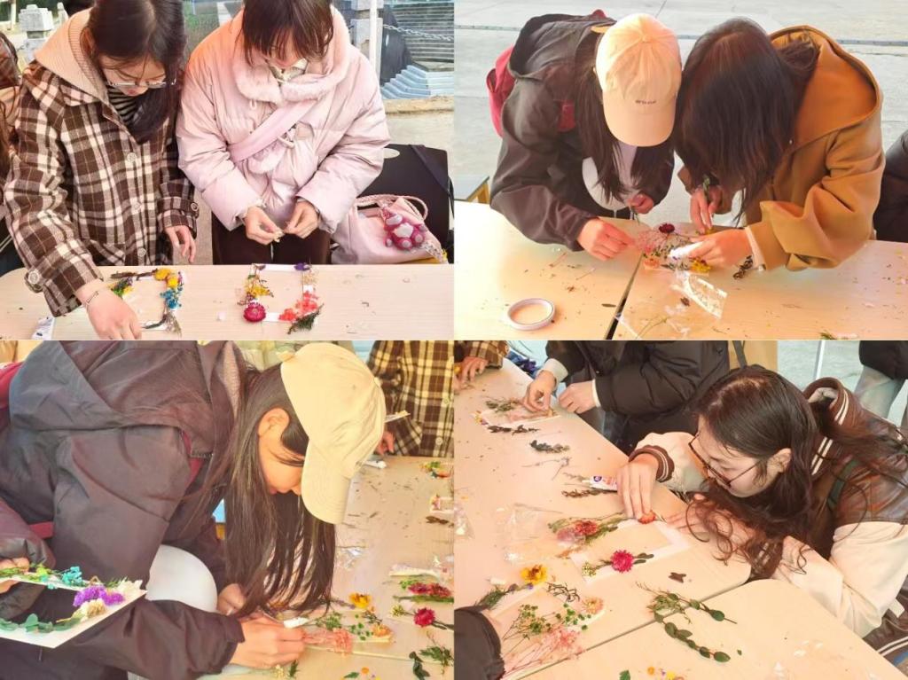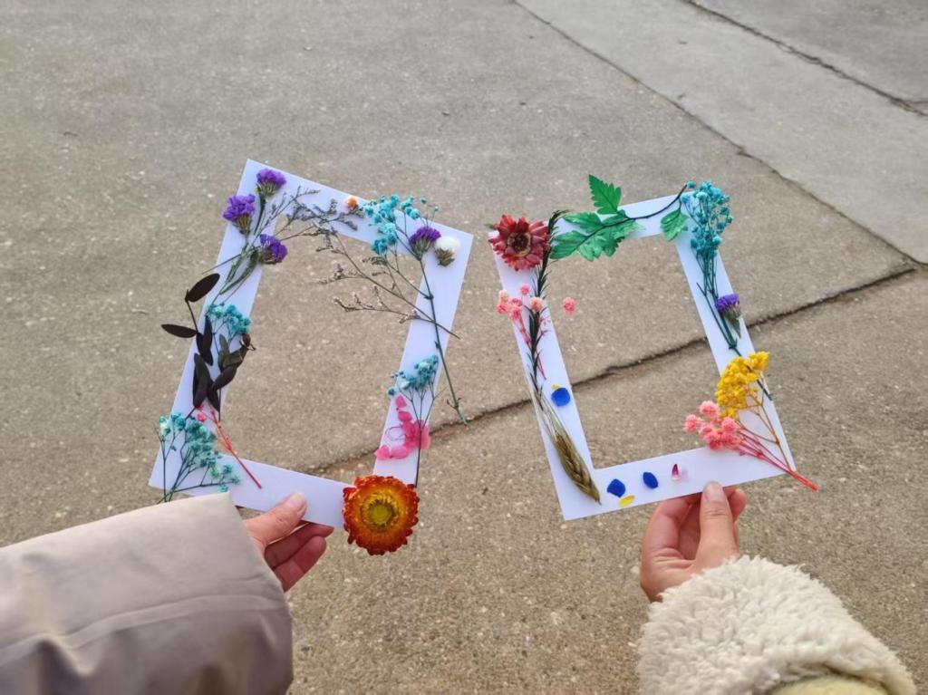活动内容主要以互动形式展开,活动内容主要是“花漾时光,框住美好”和“妙珠生花,创意手编”这两项,同学们可以在这个活动中制作干花相框以及手串。干花相框的制作过程很简单,主要就是将相框背板取下,再用镊子将干花排列到自己喜欢的位置,然后用胶水轻粘固定,等胶水干后装回背板,一个满是诗意的干花相框就制作好了。