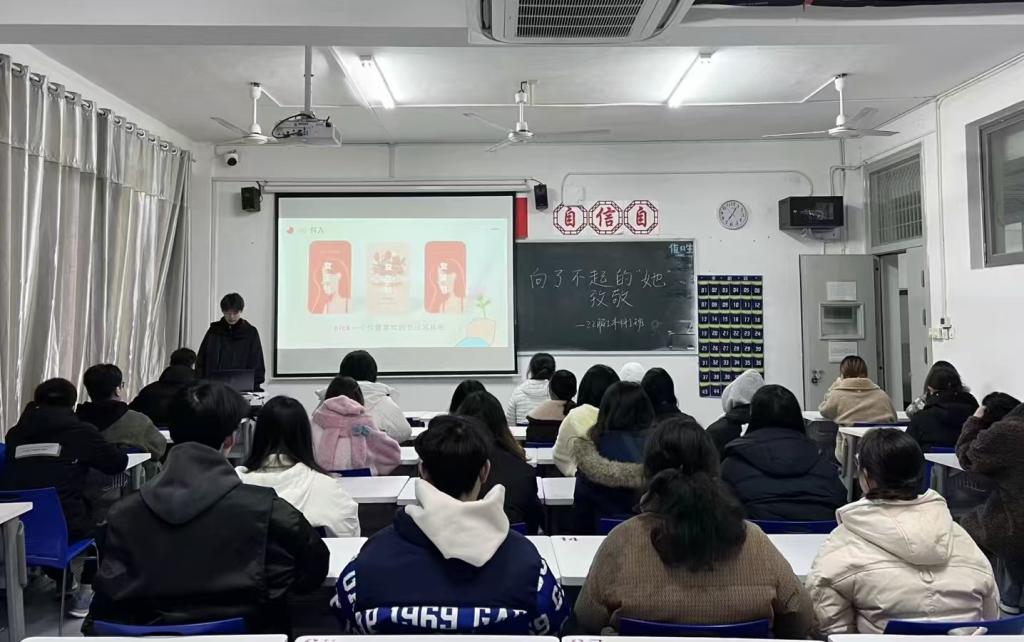 22级各班班会主题为“向了不起的‘她’致敬”。班会上班长通过分享古今中外杰出女性的故事,如铁路科技的创新先锋单杏花、外交舞台上的铿锵玫瑰华春莹、太空探索的巾帼英雄王亚平等,展现了女性在社会发展、科技创新、文化传承等领域的卓越贡献。同学们深刻感受到,女性不仅在家庭中扮演着重要角色,更在社会各领域绽放光彩。班长们倡议,大家要尊重女性、关爱女性,学习她们坚韧不拔、勇于追梦的精神。