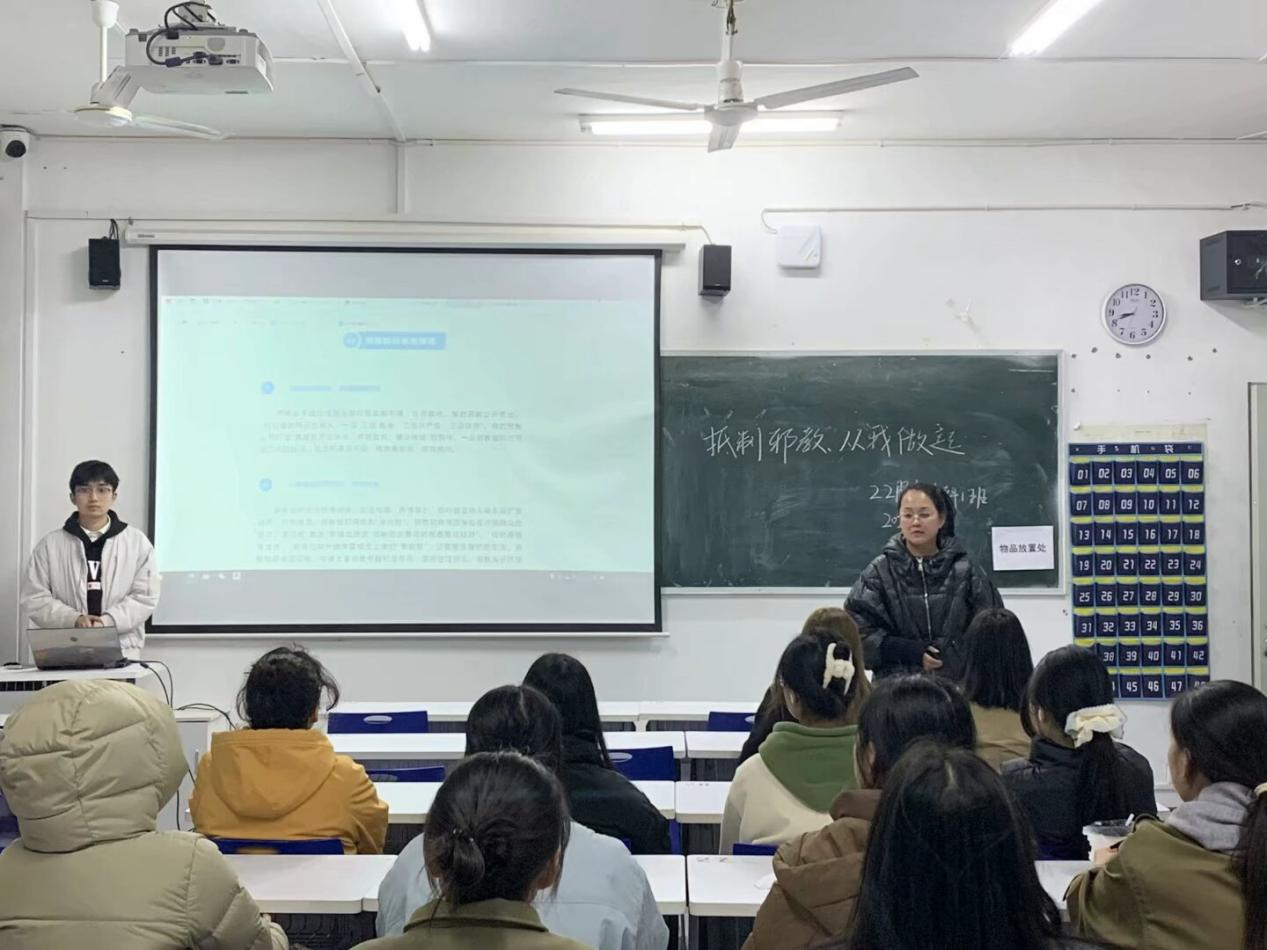 22级各班级以“抵制邪教,从我做起”为主题召开班会。班会上,班长向各位同学介绍了什么是邪教以及邪教的社会危害性以及邪教的基本特征,强调最重要的是应该警惕邪教,明确宗教与邪教是不同的,更要反对和抵制邪教,树立正确的价值观,强化自身的知识储备,规范自己的言行。