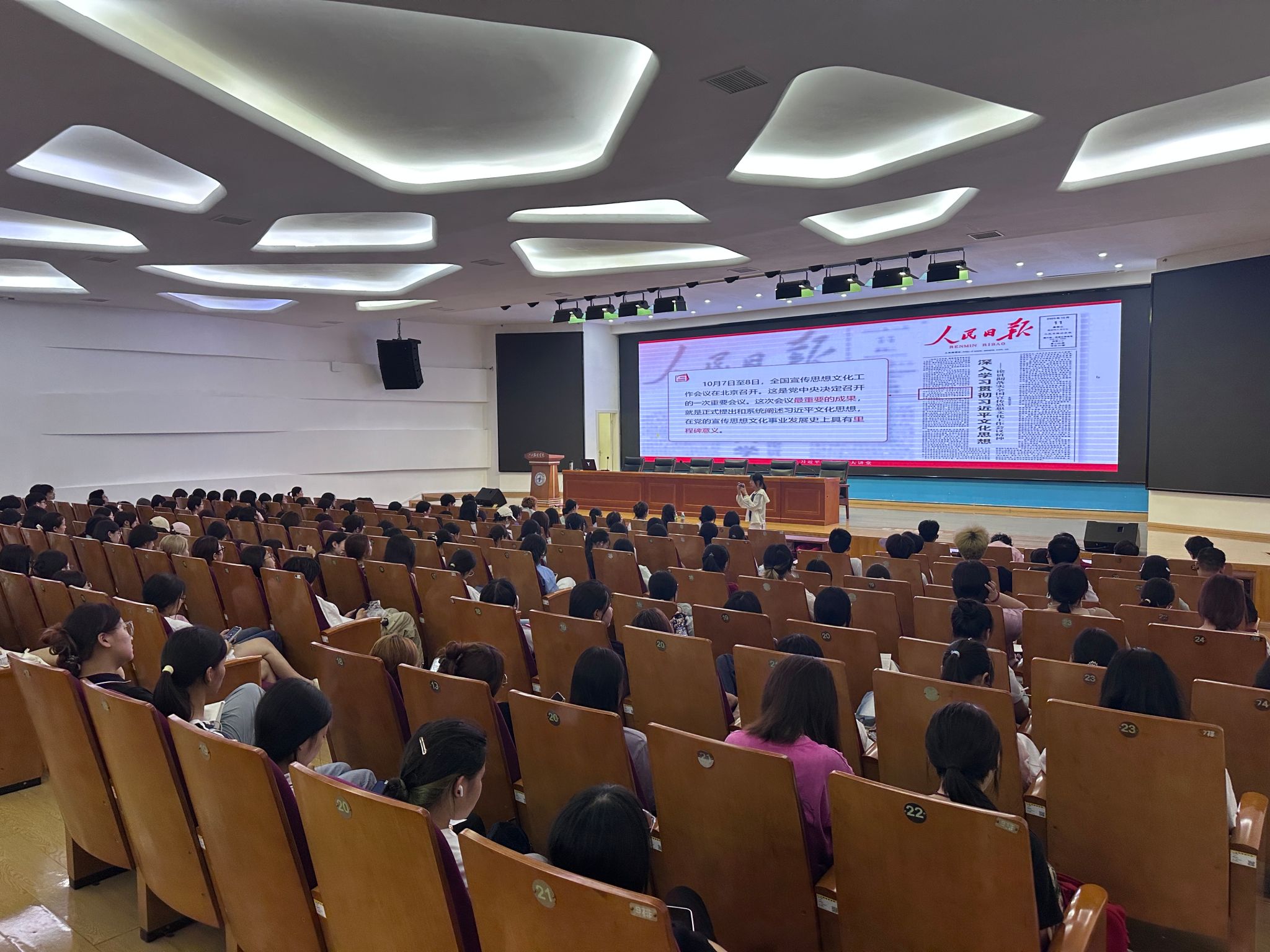 永利yl23411集团讯(撰稿:李景慧)为深入学习贯彻习近平文化思想,引导师生坚定文化自信,增强文化自觉,9月23日下午,永利yl23411集团在思贤楼三楼报告厅组织师生集中收看了“习近平文化思想大讲堂”第一讲直播课,学院全体辅导员及各年级学生代表近200人参加。