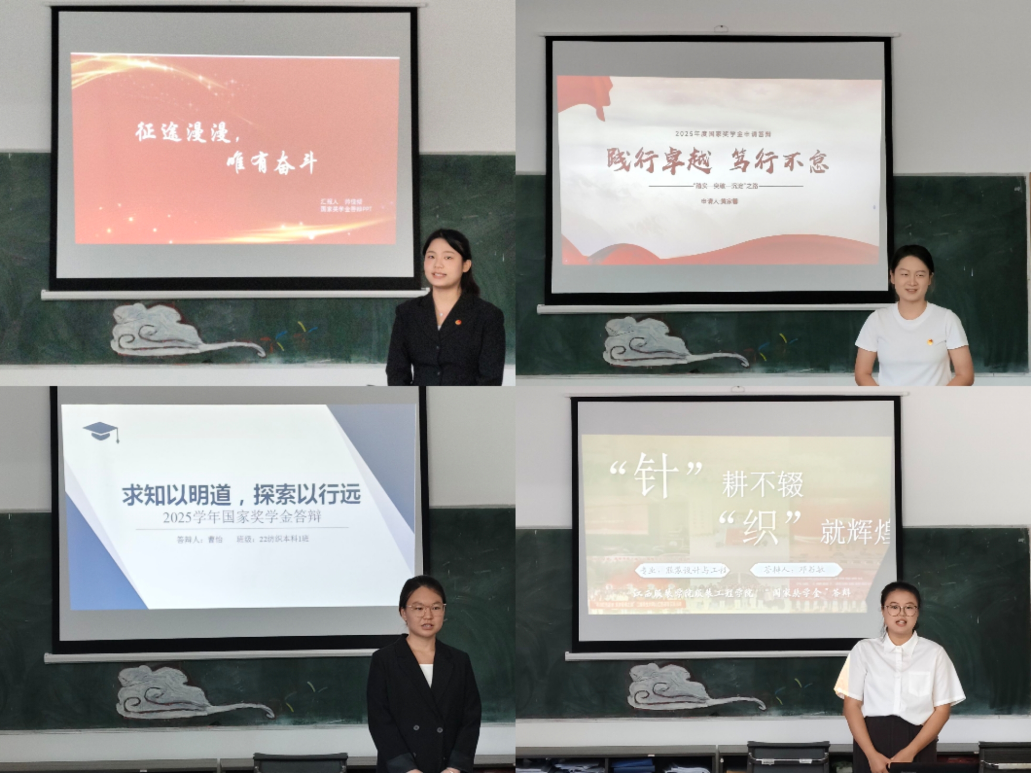 卢微展示了自己优异的学业成绩,更呈现了丰富的科研创新成果、社会实践经历以及对未来的清晰规划;黄家馨以“践行卓越 笃行不怠”为主题,阐述了自己的成长路径,从专业学习到学科竞赛,每一步都彰显着对卓越的追求;帅佳卿以“征途漫漫,唯有奋斗”为题,分享了自己在学术与实践中不断拼搏的故事,展现出新时代青年的奋斗底色;朱雅珍用“人生没有白走的路,你迈出的每一步都算数,哪怕此刻看不到结果”的座右铭激励自己,在学业与课余爱好间找到平衡,朝着“成为一名优秀的版师”的理想稳步迈进;曹怡秉持“求知以明道,探索以行远”的信念,在纺织专业领域深耕细作,用扎实的专业成绩和科研尝试证明自己;王佳双“心怀热爱,静待花开”,在热爱的领域不断深耕,让青春在奋斗中绽放光彩;宁慧莹作为纺织工程专业第一名,结合班长职务的责任担当,展现了优秀的综合实力;邓书敏“针耕不辍,织就辉煌”,在服装设计与工程专业领域,用创意与实干诠释着对专业的热爱;孔新宇以“悟已往之不谏,知来者之可追”为座右铭,身兼班长与服工设计社团社长,在服务同学与专业实践中双向成长,余如欣则聚焦研究与创新设计,立志为服装行业发展贡献力量。