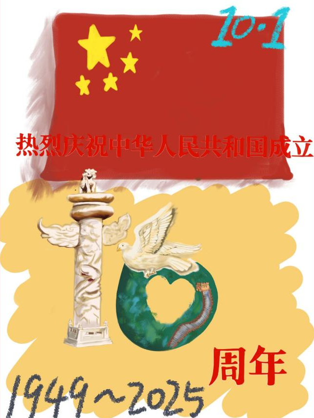 设计说明:海报以鲜艳的五星红旗为底色,华表巍峨矗立,和平鸽携着对祖国的祝福展翅翱翔,数字“76”巧妙融合长城元素与爱心意象,“1949-2025”的时光印记,诉说着祖国从新生到辉煌的壮丽征程。