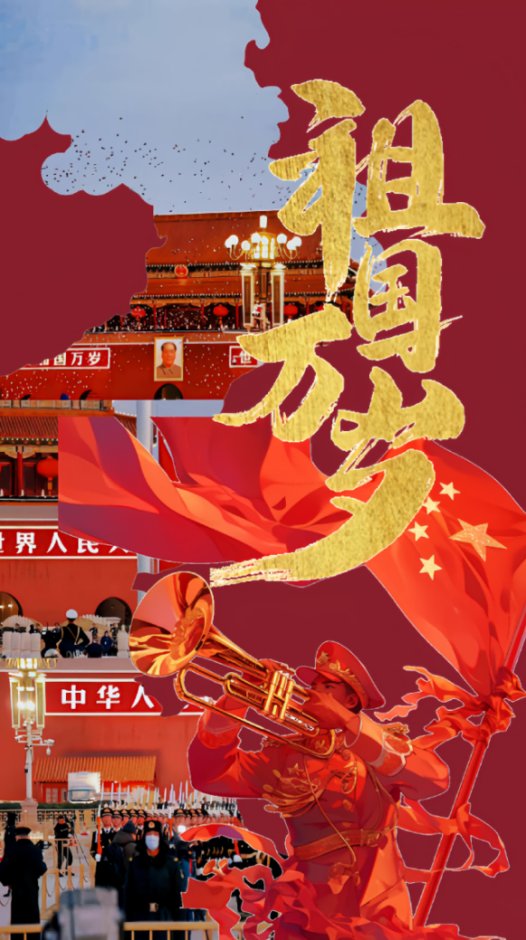设计说明:这张海报以天安门、五星红旗、军号手等元素,结合“祖国万岁”金色大字,表现了对祖国的赤诚热爱,象征着国家的繁荣昌盛与人民的爱国情怀,传递出人民对祖国深深的敬意与祝福,激发了大众的爱国热忱。