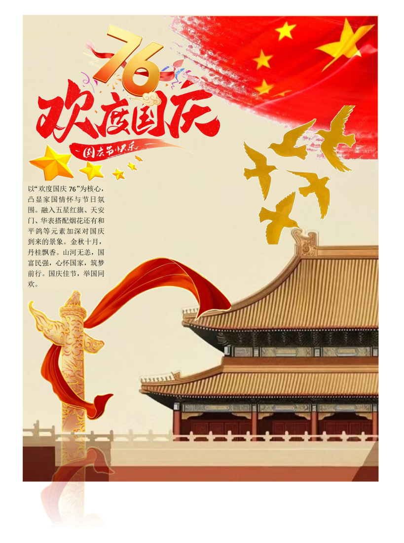 设计说明:海报以“欢度国庆76周年”为核心主题,凸显家国情怀与节日氛围。融入五星红旗、天安门、华表等搭配烟花和和平鸽等元素加深对国庆到来的印象。金秋十月,丹桂飘香。山河无恙,国富民强。心怀国家,筑梦前行。国庆佳节,举国同欢。
