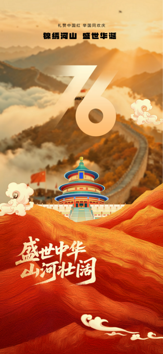 设计说明:海报以庆祝新中国成立76周年为主题,融合长城、天坛两大标志性景观,长城蜿蜒于云海山峦间,彰显山河辽阔之壮美;天坛色彩绚丽,尽显传统建筑之典雅。搭配吉祥云纹与红色绸带元素,既传递出国泰民安、山河锦绣的盛世气象,又以传统符号与现代设计语言的结合,礼赞中国红,共庆盛世华诞,展现我对祖国繁荣昌盛的美好祝愿。