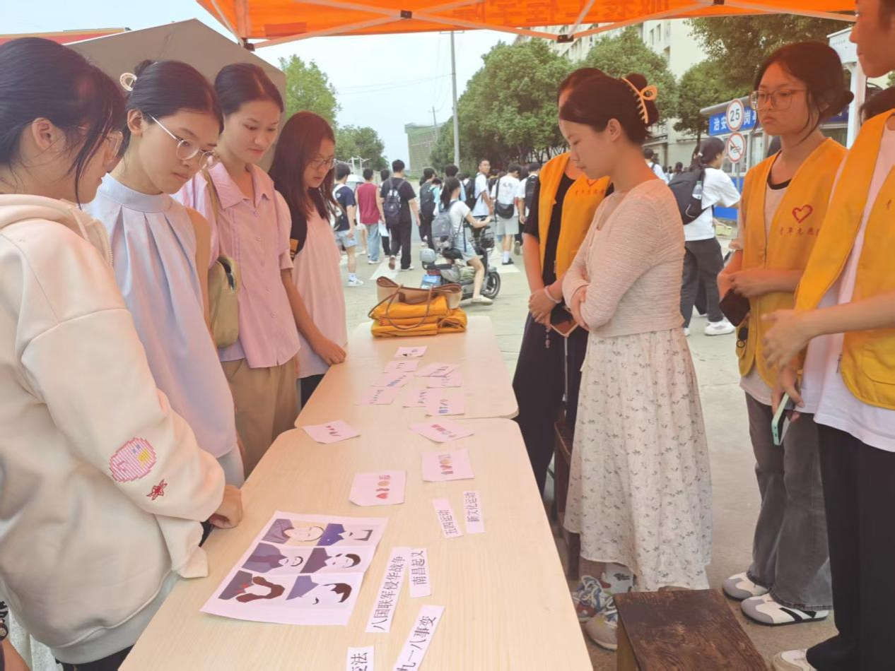 活动吸引了众多同学参与,现场设置了看图猜历史人物、emoji猜事件、红色历史事件线排序等环节。在看图猜历史人物环节中,李大钊、雷锋等先烈的图像资料被逐一展示,同学们或低头思索,或小声交流事迹细节,在辨认中重温英雄故事;emoji猜事件环节颇具巧思,生动的符号让厚重历史变得鲜活,现场同学踊跃抢答;在红色历史事件线排序环节里,“辛亥革命”“新中国成立”等事件卡片被打乱摆放,参与的同学围在一起梳理时间脉络,在反复调整中厘清历史发展逻辑,不少同学完成后还主动向同伴讲解事件背景。