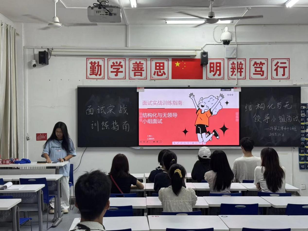 24级和22级各班班会以“面试实战——结构化+无领导小组模拟演练”为主题,班会围绕四部分展开讲解。各班班工先讲解了结构化面试方面的内容,强调以逻辑征服考官,需展现五大能力,通过真题示例说明要将经历转化为价值,还给出团队协作、应急处理题的应对方法。然后又讲解了无领导小组讨论,说明流程与角色技巧,强调框架和共识的重要性。接着分享数据量化成果等通用技巧,最后组织分组模拟实战题,旨在帮助学生以逻辑和协作自信应对面试,提高毕业生的应试技巧。