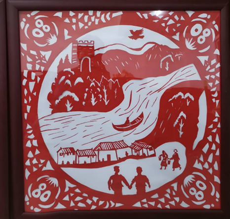 作品以剪纸刻画山水、村落、长城与军民互动场景。河流、舟船、屋舍勾勒出质朴生活,军民携手、民众相迎的画面,传递出抗战时期军民鱼水情深的温情,也以长城、山水寄寓家国安宁的美好祈盼,尽显剪纸艺术对军民情谊与家国情怀的生动表达。